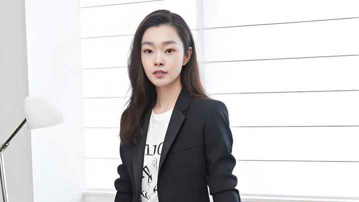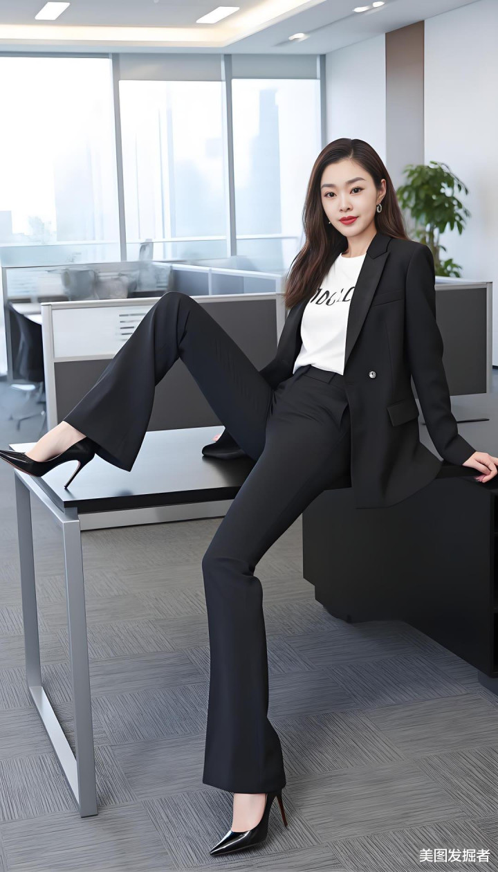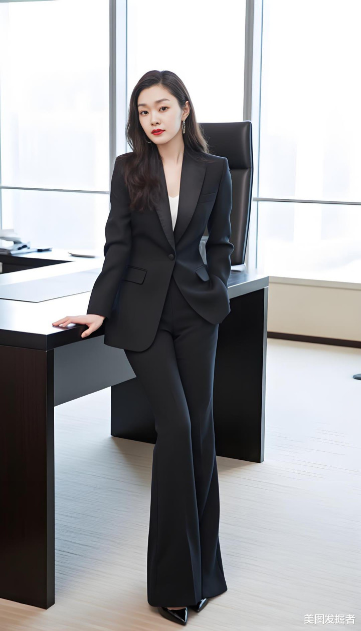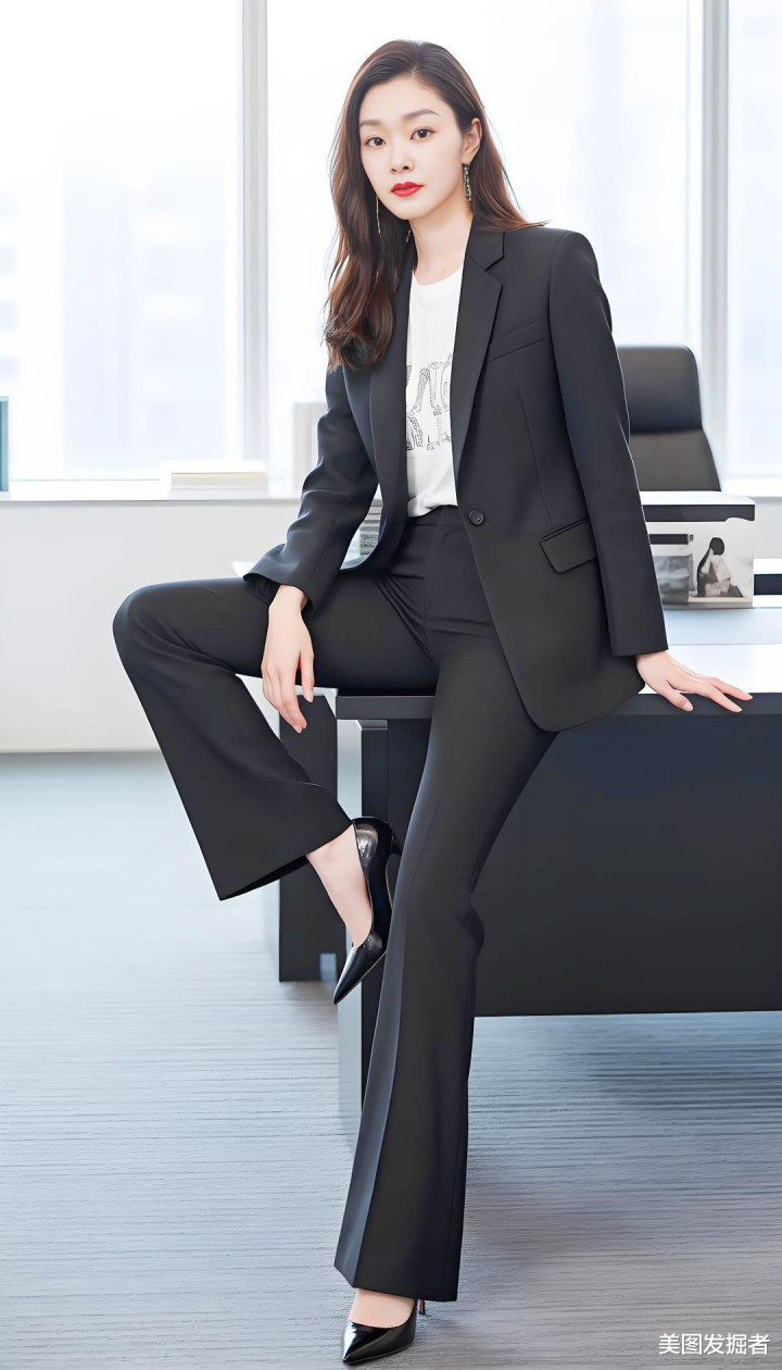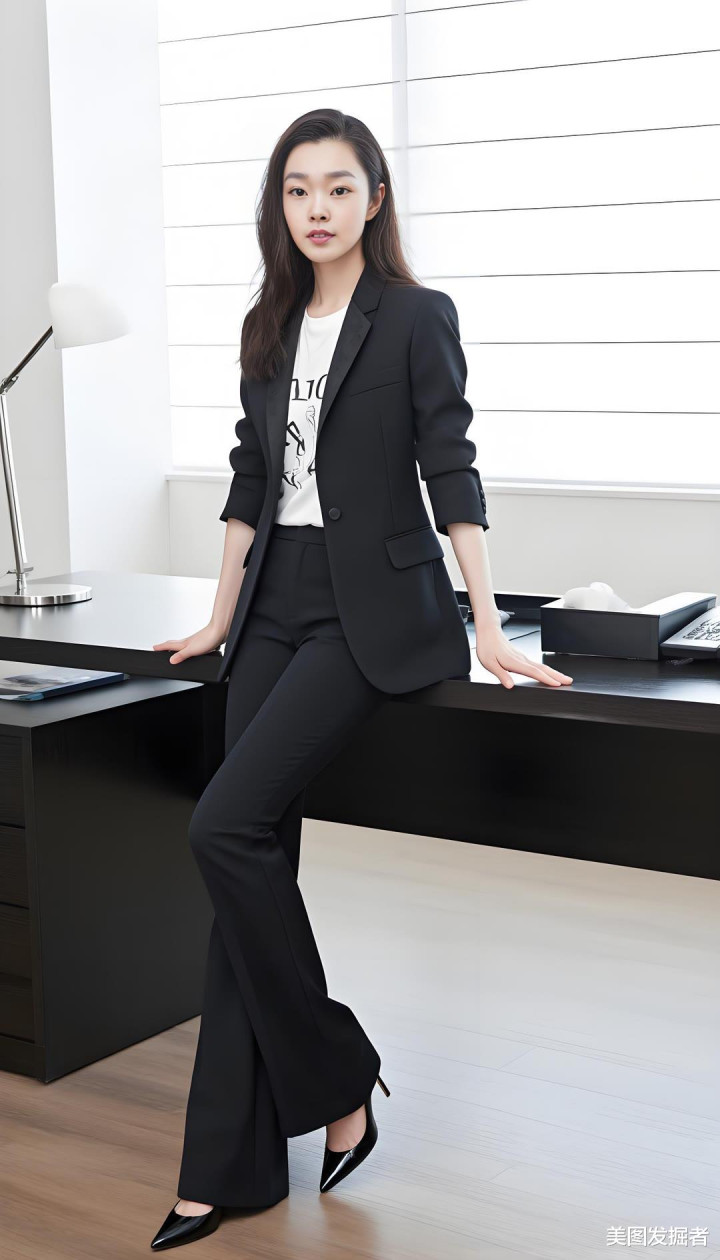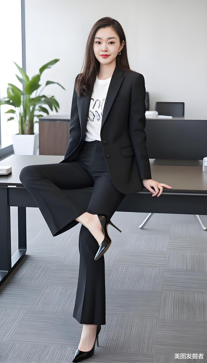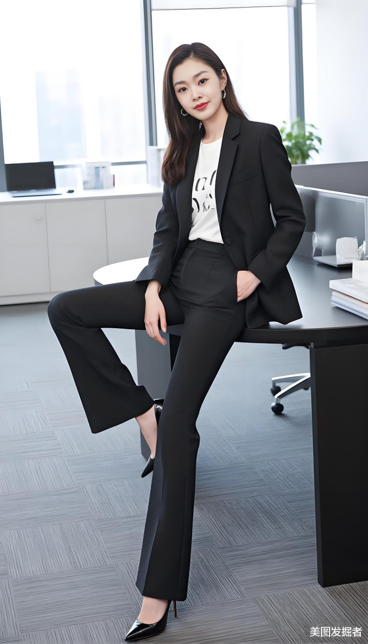 黑色西装外套利落剪裁,内搭白色T恤简约随性,黑色喇叭裤勾勒修长双腿,脚踩高跟鞋瞬间提升气场。她以优雅曲线与干练气质,在职场中自信绽放。